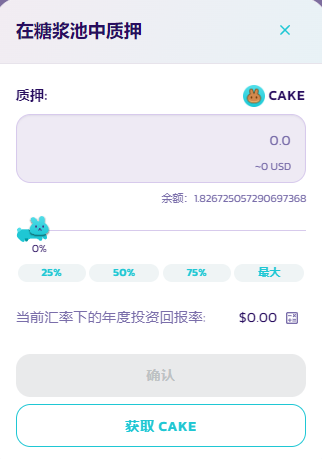 6. 对于灵活质押，只需按**灵活**，会显示一个新窗口，输入您要质押的 CAKE 数量，单击**确认**并确认您钱包中的交易。