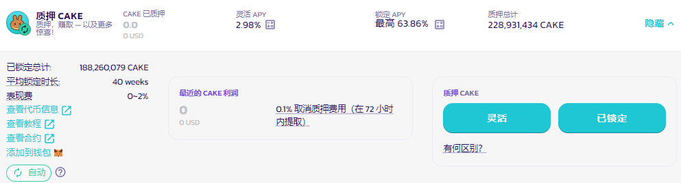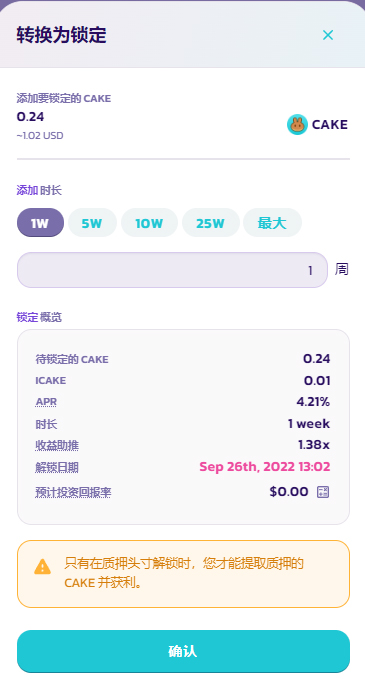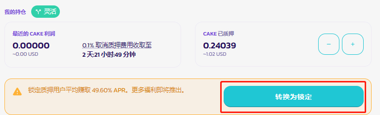 想要将您的灵活质押转换为锁仓质押以赚取更多 CAKE？ 只需单击转换为锁仓并选择要锁仓 CAKE 的时长即可。