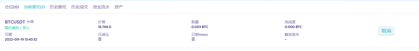 订单发送后，将显示在 “当前委托” 中，直到成交完毕。