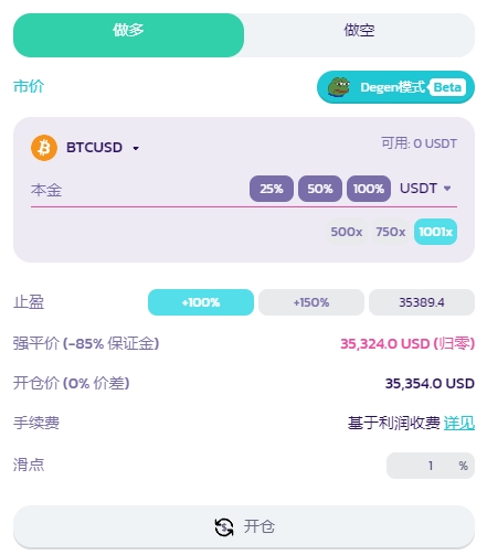目前 Degen 交易模式仅初步可用于 BTCUSD、ETHUSD 交易对，支持市价单多单、空单最大 1001 倍的杠杆率。交易者在开设零滑点仓位前，需要先输入本金数额（保证金数额）。