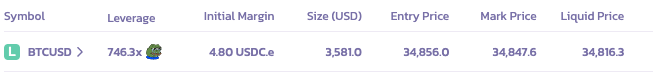 5. 您的仓位将显示在页面底部的 "仓位" 选项卡中。如您想确认 Degen 模式是否已激活，可以查看杠杆（Leverage）一栏，如出现 "Pepe" 图标，表示这是 Degen 模式的仓位。