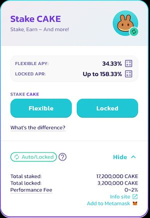 Con ambos, simplemente puedes depositar tus CAKE para ganar más CAKE sin tarifas de depósito. El staking flexible permite a los usuarios depositar CAKE y ganar recompensas con la capacidad de retirar cuando lo deseen. El staking a plazo fijo ofrece a los usuarios la oportunidad de maximizar su rendimiento y ganar aún más CAKE al bloquear sus CAKE depositados durante un período de tiempo que elijan, ganando un APR potenciado linealmente en comparación con el staking flexible.