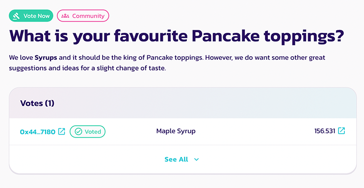 Seu poder de voto é igual ao seu saldo veCAKE no bloco de snapshot.