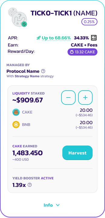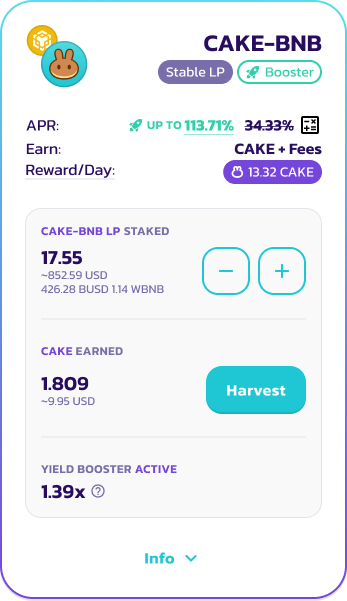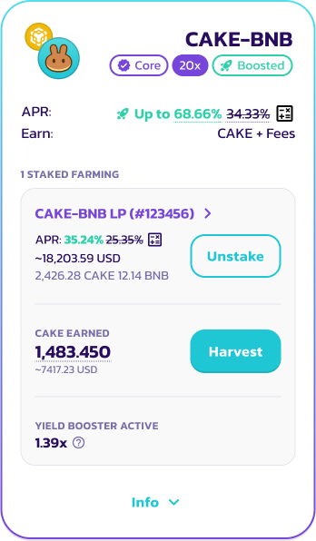Como o iCAKE e o vCAKE, o bCAKE é um benefício do stake de veCAKE projetado para nossos fiéis Holders de CAKE. Ao bloquear o CAKE, você obtém o veCAKE, que automaticamente fornece o bCAKE. Você pode aumentar os ganhos de farms selecionadas em até 2,5x.