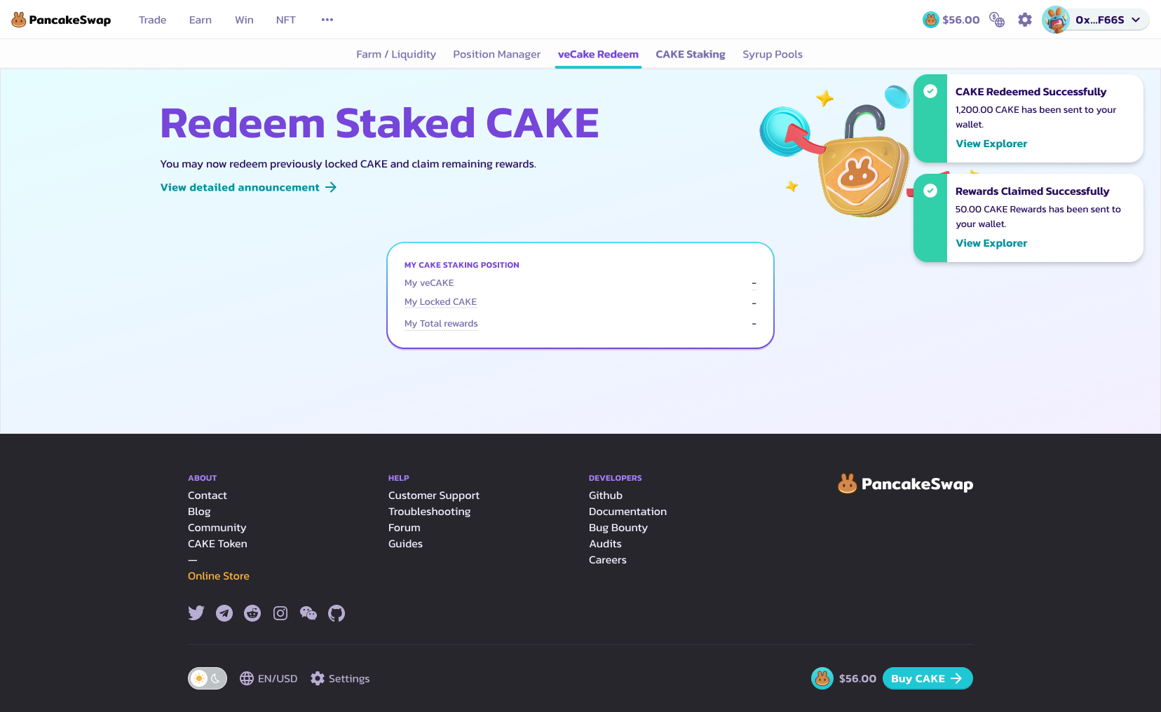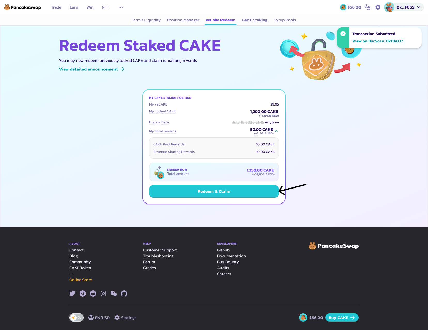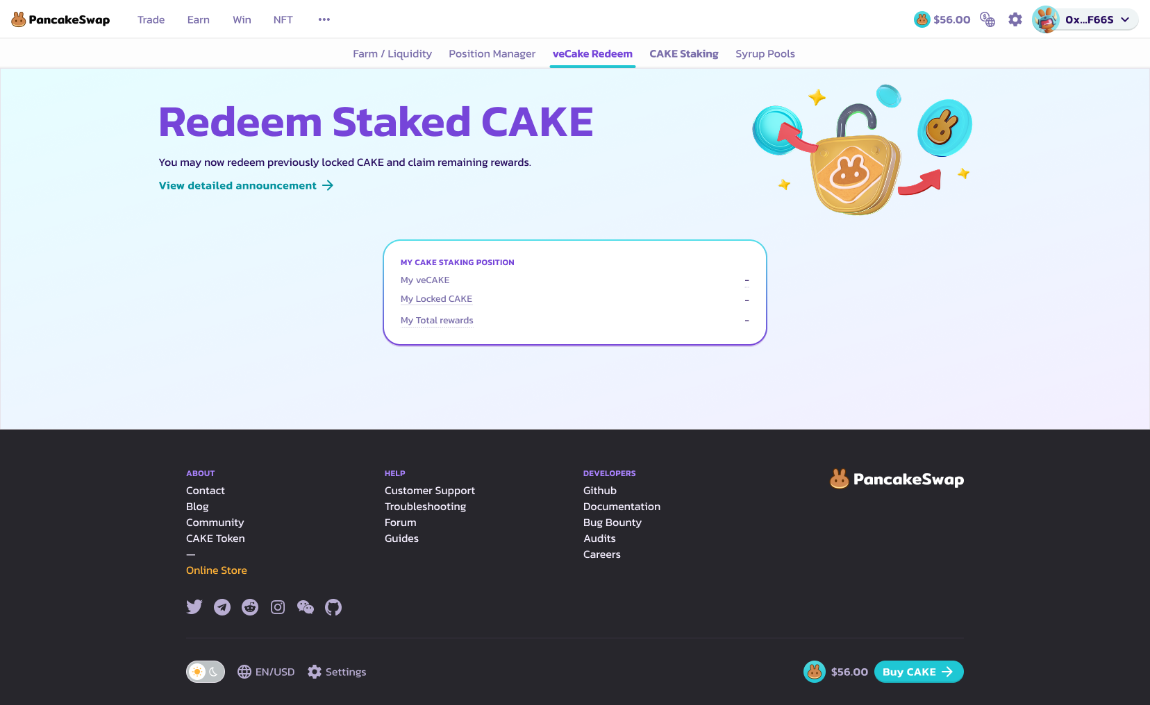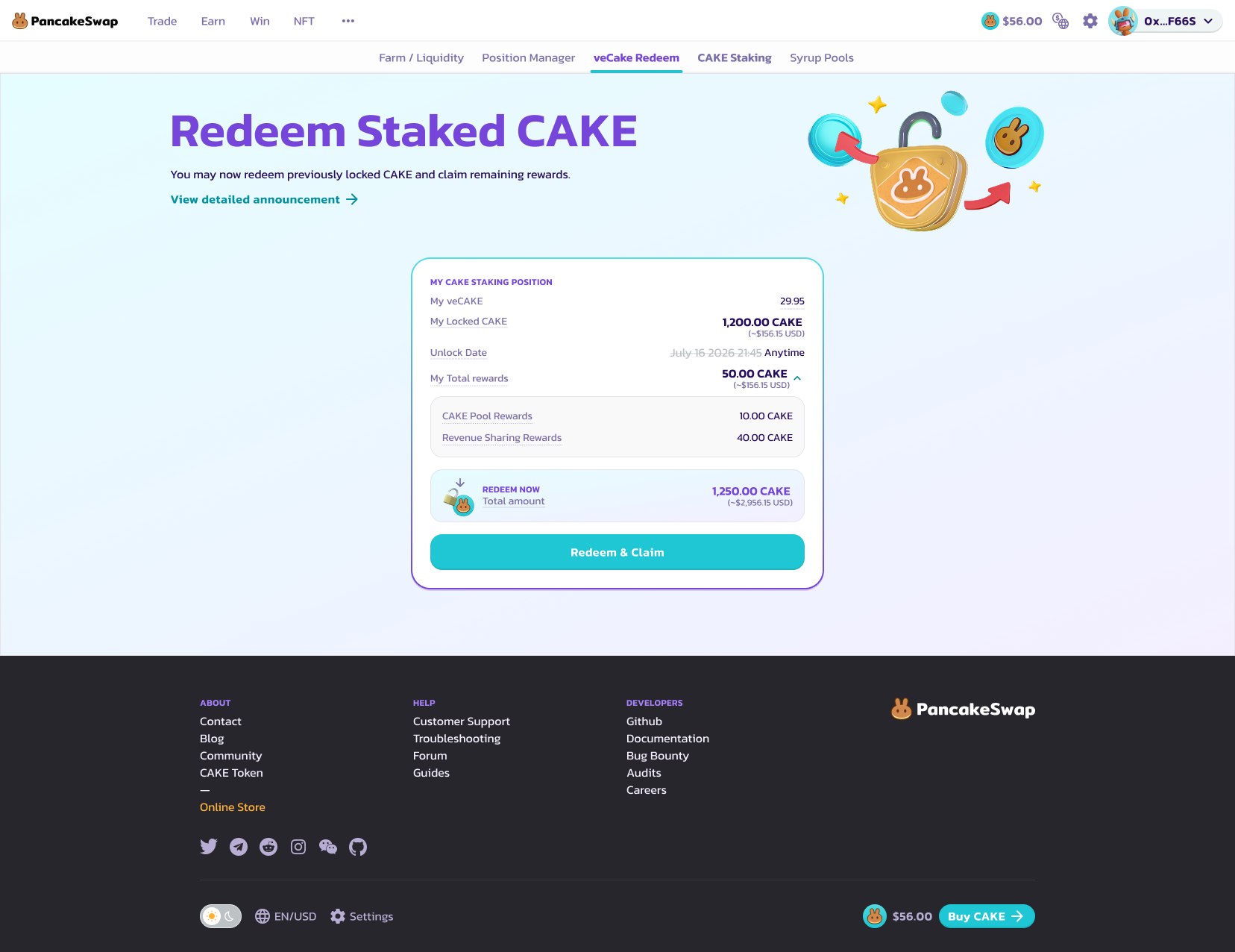<figure><img src="https://3482112246-files.gitbook.io/~/files/v0/b/gitbook-x-prod.appspot.com/o/spaces%2F-MHREX7DHcljbY5IkjgJ-957349888%2Fuploads%2FgBtqr38qa2xxeP9CTEBz%2Fredeem%20staked%20cake%20after%20connect.png?alt=media&#x26;token=39a60aee-3cb6-4081-a3c5-309ce51bf5ee" alt=""><figcaption></figcaption></figure>