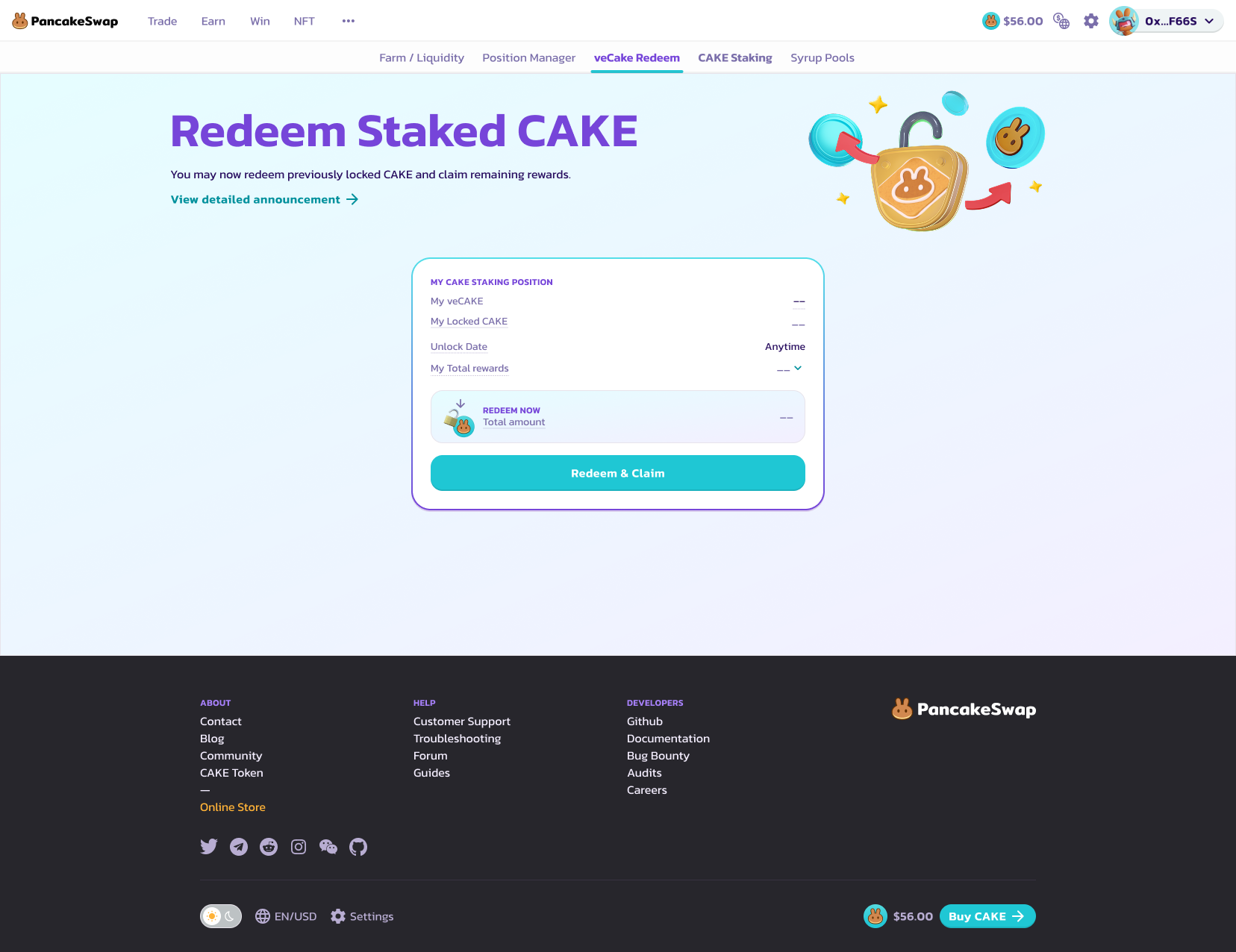 <figure><img src="https://3482112246-files.gitbook.io/~/files/v0/b/gitbook-x-prod.appspot.com/o/spaces%2F-MHREX7DHcljbY5IkjgJ-957349888%2Fuploads%2FIJJhE0ZIfZvlHPoWySfj%2FRedeem%20Staked%20Cake%20before%20connect.png?alt=media&#x26;token=4d6f712c-290e-46bb-8c89-f20c4df46683" alt=""><figcaption></figcaption></figure>