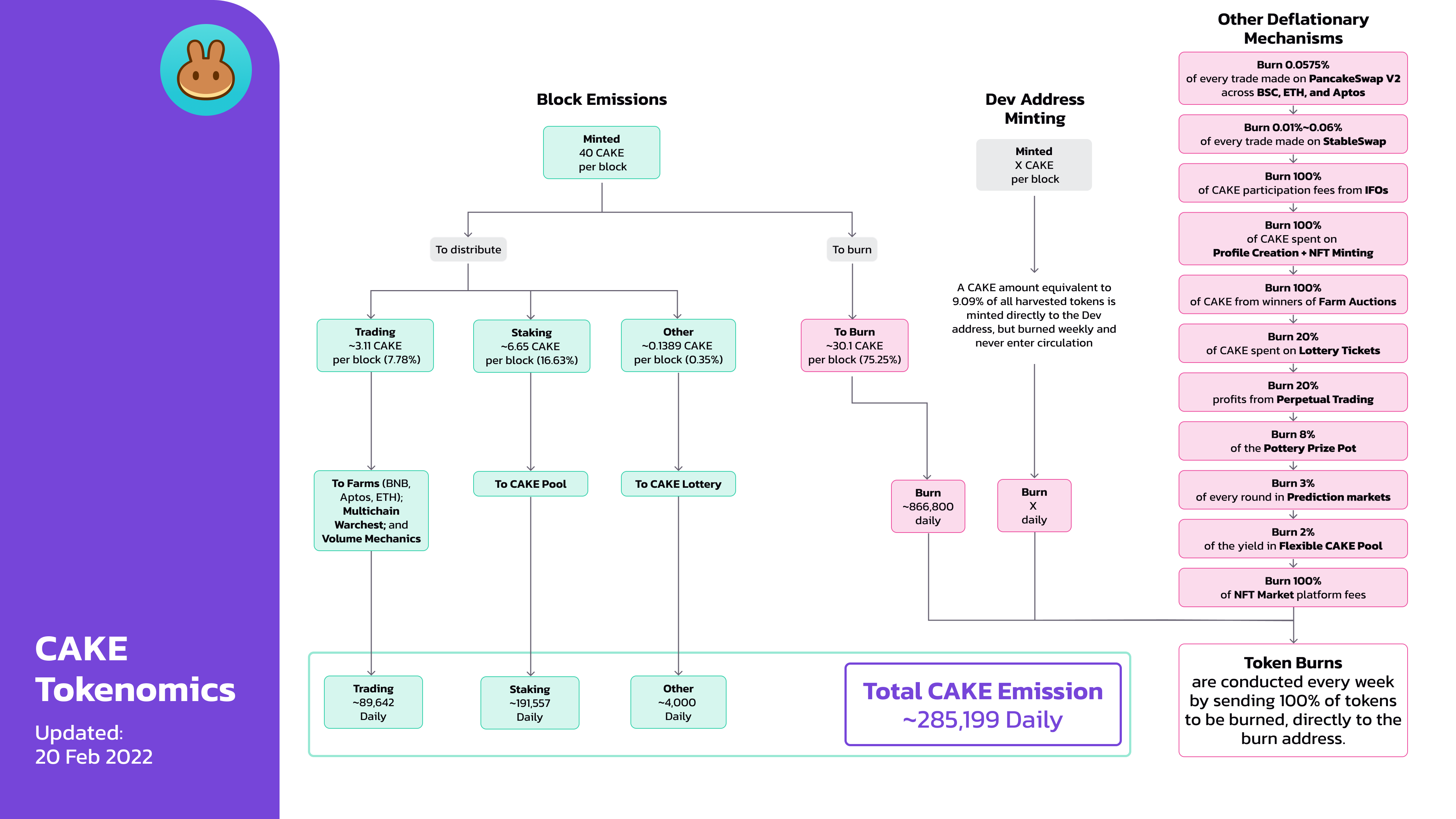 <table data-header-hidden><thead><tr><th>Distributed to</th><th width="154" align="right">Reward/block (% of emission)</th><th width="158" align="right">Reward/block (total CAKE)</th><th align="right">Reward/day</th></tr></thead><tbody><tr><td>Distributed to</td><td align="right"><p>Reward/block</p><p>(% of emission)</p></td><td align="right"><p>Reward/block</p><p>(total CAKE)</p></td><td align="right">Reward/day</td></tr><tr><td>Trading</td><td align="right">~7.78%</td><td align="right">~3.11</td><td align="right">89,642 (approx)</td></tr><tr><td>Staking</td><td align="right">~16.63%</td><td align="right">~6.65</td><td align="right">191,557 (approx)</td></tr><tr><td>Other</td><td align="right">~0.35%</td><td align="right">~0.1389</td><td align="right">4,000 (approx)</td></tr><tr><td><strong>Total Daily CAKE Emission</strong></td><td align="right"></td><td align="right"></td><td align="right"><strong>285,199 (approx)</strong></td></tr></tbody></table>